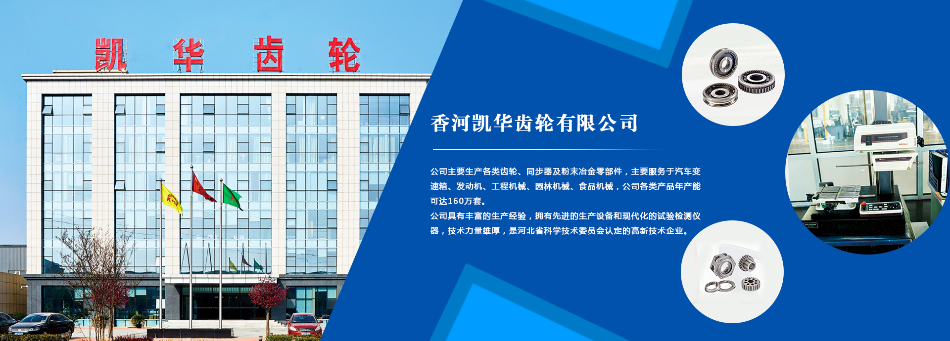 香河凱華齒輪有限公司是一家民營企業,位于香河經濟開發區,毗鄰京津,交通便利。公司占地面積7萬平米,注冊資本1360萬元,現有員工400余人,其中技術質量工程人員70余名,擁有中高級職稱人員30余名。公司主要生產各類齒輪、同步器及粉末冶金零部件,主要適配汽車變速箱與發動機,公司各類產品年產能可達160萬套。